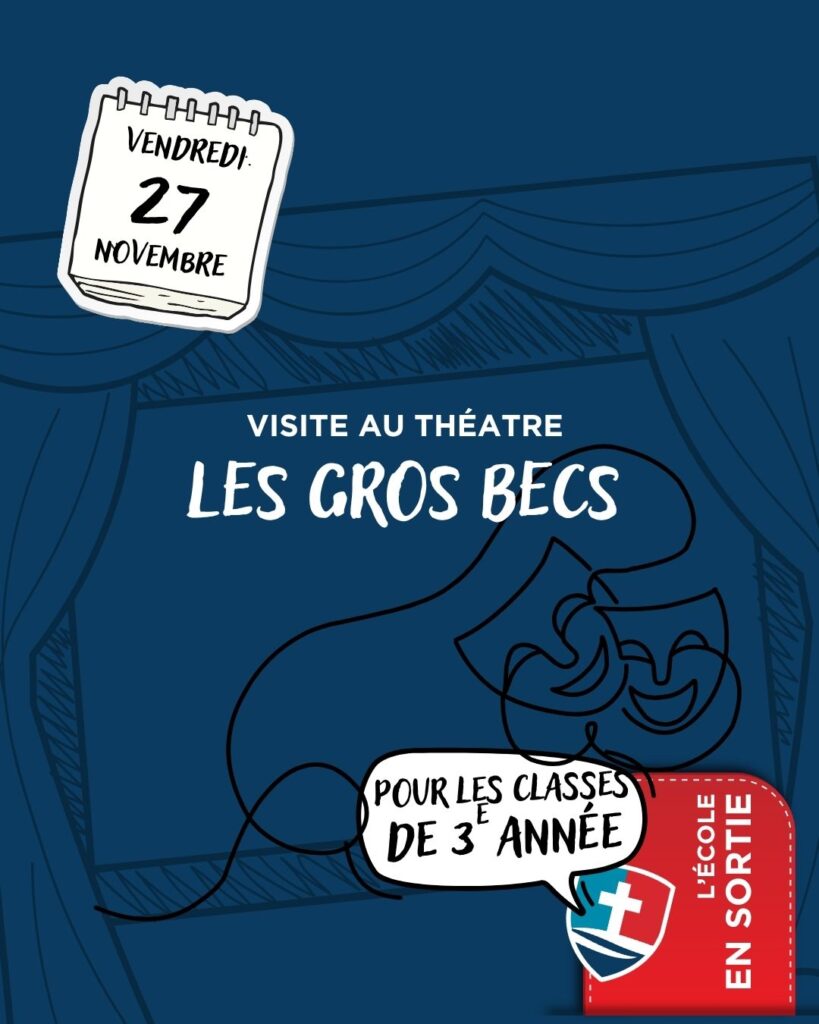 Sortie au Théâtre Les Gros Becs! Le 27 novembre 2025, nos élèves de 3e année auront la joie d’assister à un spectacle au Théâtre Les Gros Becs, dédié aux jeunes spectateurs!